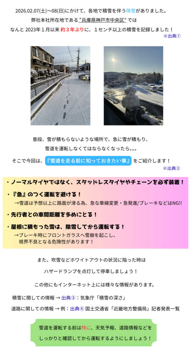 2026.2.10 / 最終更新日時 : 2026.2.10 トールウェイサービス株式会社 お知らせ 雪道を走る前に知っておきたい事。 出典①:神戸新聞2026/2/8 出典②:JAF(日本自動車連盟) 出典③:気象庁「積雪の深さ」 出典④ 国土交通省「近畿地方整備局」記者発表一覧 Follow me! FacebooktwitterHatenaPocketCopy コメントを残す コメントをキャンセルメールアドレスが公開されることはありません。 ※ が付いている欄は必須項目ですコメント ※ 名前 ※ メール ※ サイト 次回のコメントで使用するためブラウザーに自分の名前、メールアドレス、サイトを保存する。 Δ